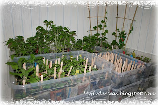 Når plantene vokser seg større er det tide for omplanting i større potter med mer næringsrik jord. Jeg fant denne fremgangsmåten på You Tube Cheap starter pot made from newspaper og disse fungerer kjempebra. Det flotte er at pottene er firkantet - det er plass sparende når en har mye småplanter. Jeg anbefaler imidlertid at du bruker stiftemaskin for å feste pottene i toppen istedet for tape.