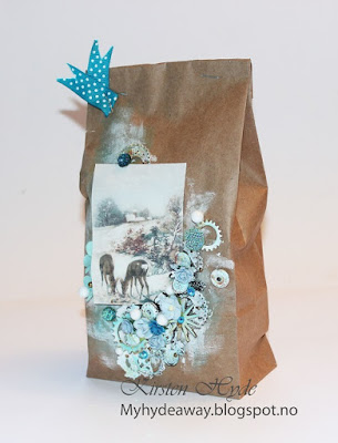 Sometimes, I want to create a masculine wrapping of a present. These bags have been decorated in a mixed media style, without a hint of Christmas. The base for the bags are simple kraft bag and are bloged for Hobbykunst
